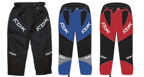Lightweight nylon, reinforced knees, Lycra crotch for increase in motion. Black, Black/Blue, Red/Blue.